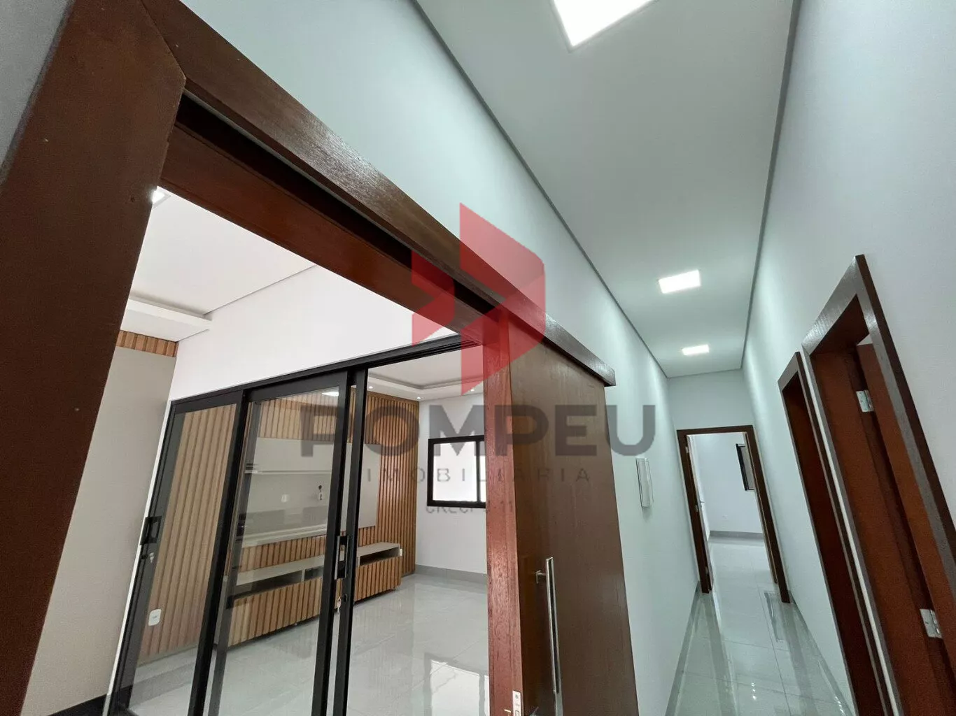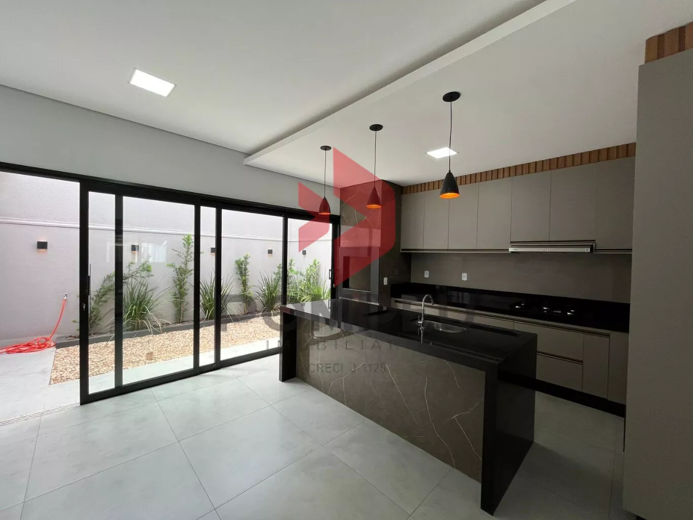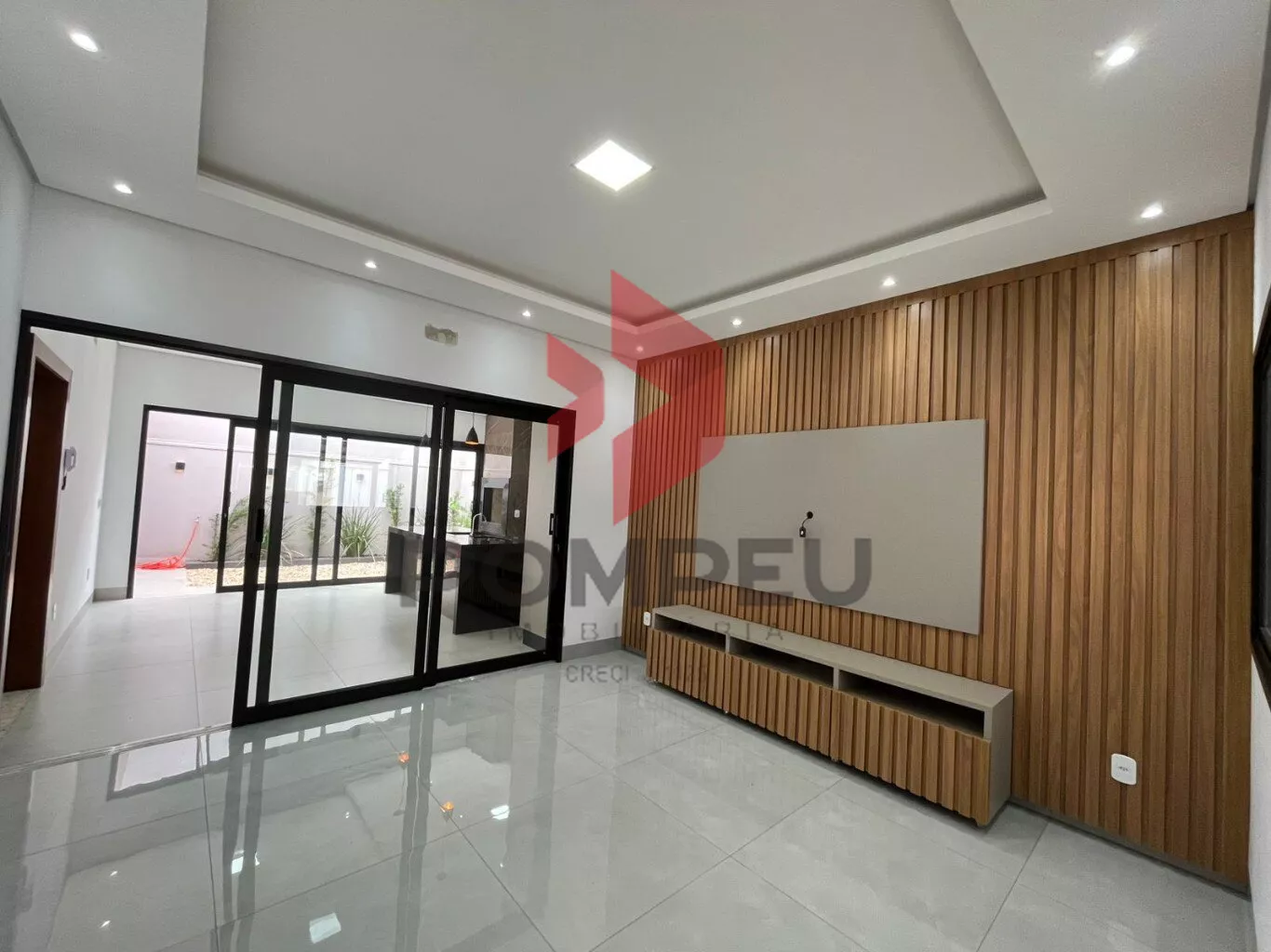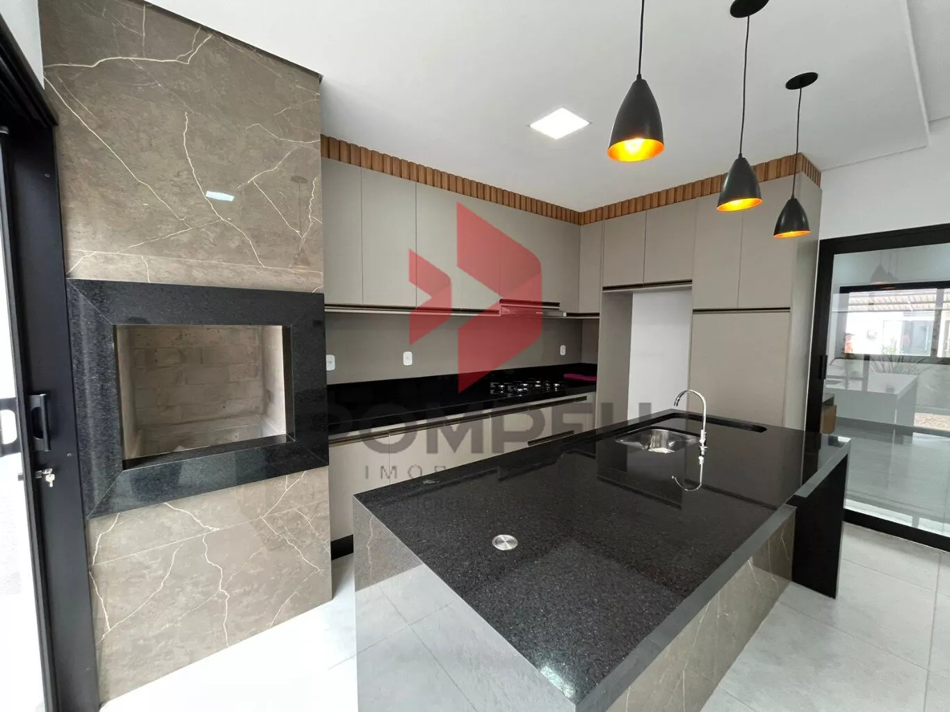 LIVING COM PAINEL EM RIPADO INTEGRADA A ÁREA GOURMET, TODA NO ARMÁRIO, ILHA E CHURRASQUEIRA;